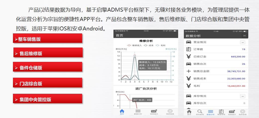 啟擎智能運營BI管理系統V2.8產品以結果數據為導向,基于啟擎ADMS平臺框架下,無縫對接各業務模塊,為管理層提供一體化運營分析為宗旨的便捷性APP平臺。產品包含整車銷售版,售后維修版、門店綜合版和集團中央管控版,適用于蘋果IOS和安卓Android。