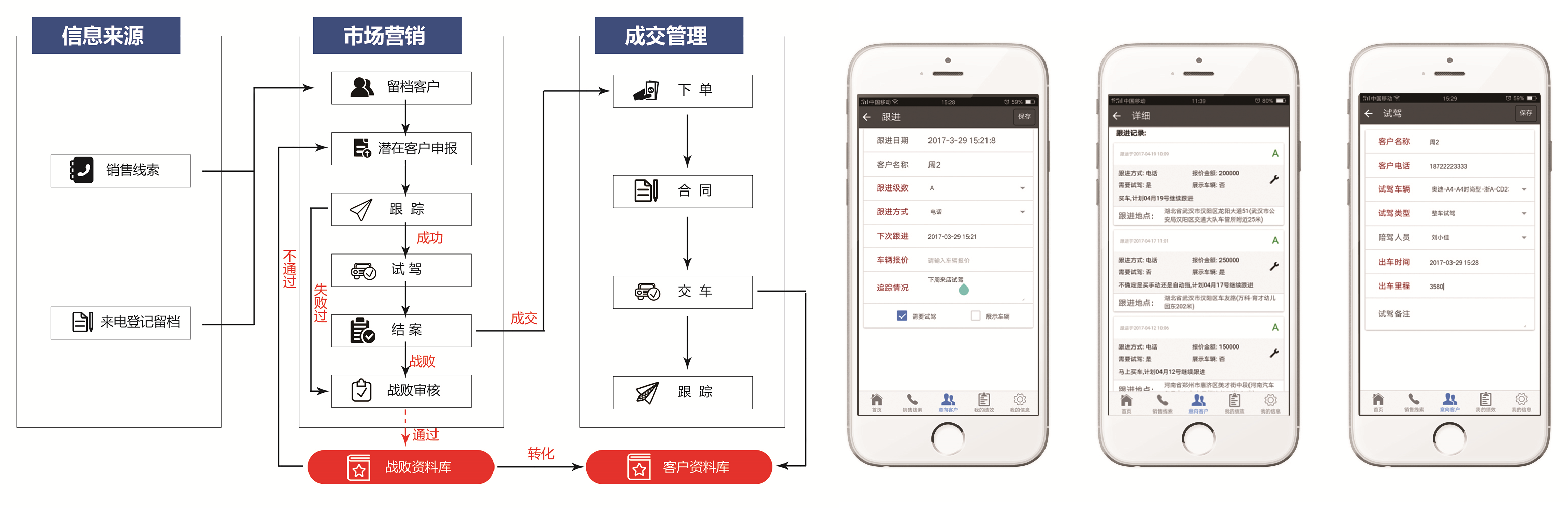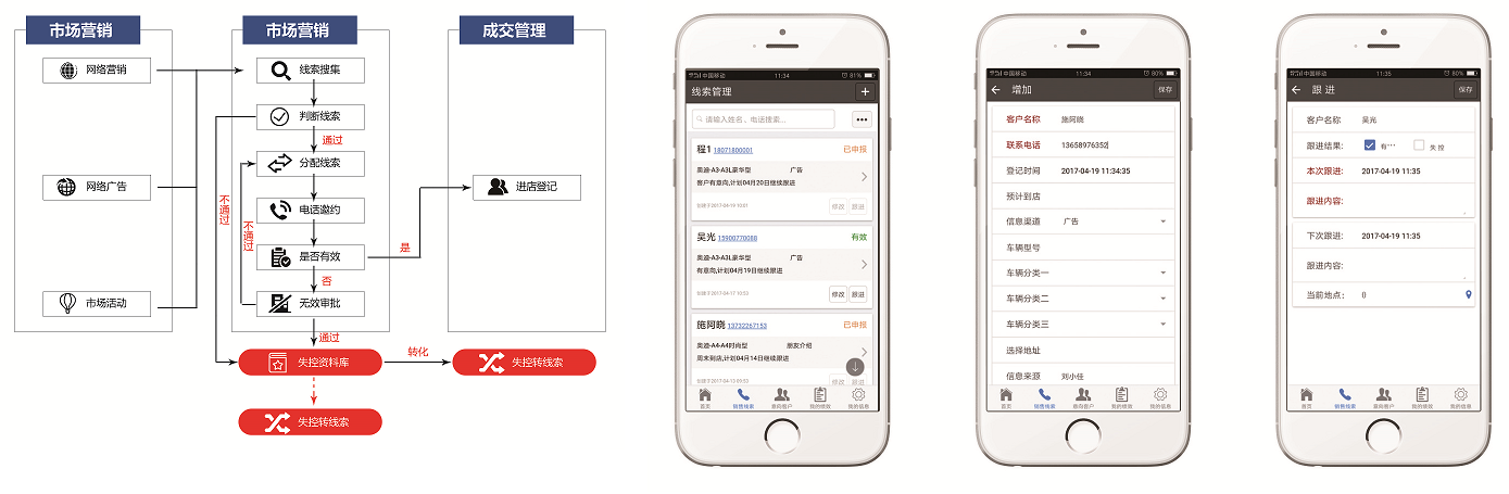 銷售管理人員不用再去問銷售顧問,每個顧客的成交進(jìn)度條,系統(tǒng)自動生成,手機(jī)可以檢索顧客電話、哪個車型有多少潛客隨時查詢、成交后顧客的系統(tǒng)要求強(qiáng)制跟進(jìn);
