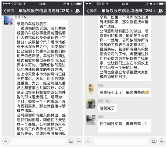 車螞蟻官方向股東發布的解散聲明稱,經公司股東委員會和董事會共同決議:公司決定出售車螞蟻業務或公司并購的形式退出回報。期限為1個月,如果一個月內市場上沒有找到買家,那么就直接申請破產清算。