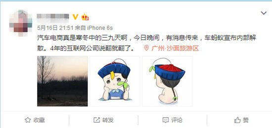 【億邦動力網訊】5月17日消息,昨日晚間有業內知名記者在微博上稱汽車后服務電商公司車螞蟻正式宣布解散。今日,有媒體透露,車螞蟻財務總監肖丹娜(花名:豆豆)昨晚在正式發布解散公告,證實了消息的真實性。